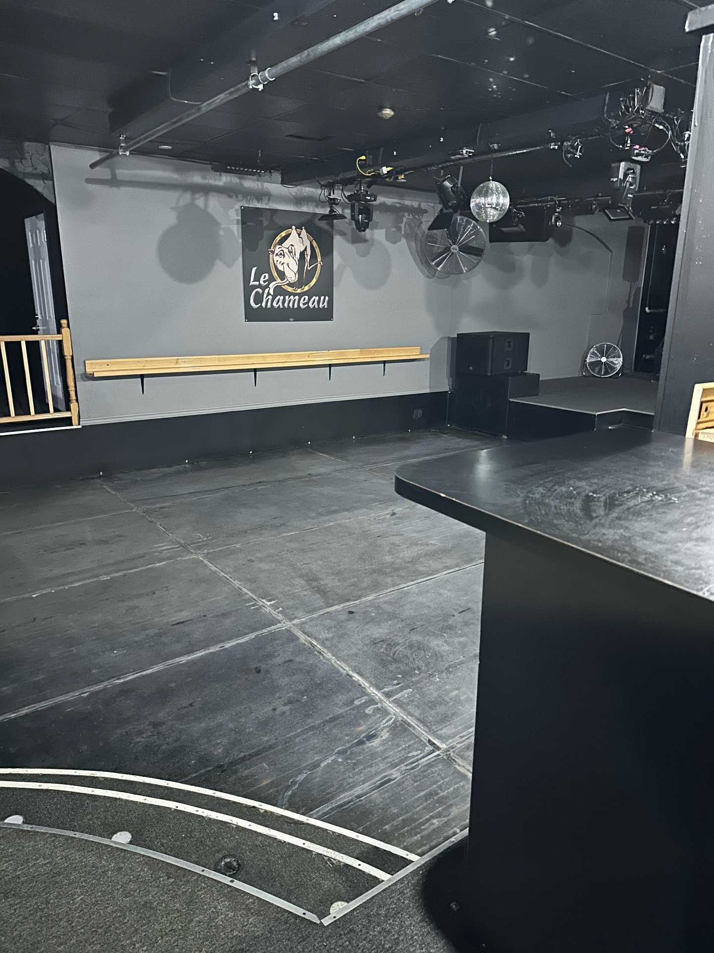 Liste des équipements du côté CHAMEAU Guichet automatique Chambre froide Réfrigérateur à bière Projecteur avec écran rétractable Système de son complet avec caisse de 10000 Watts Système de lumière au plafond avec 6 robots et plusieurs lumières au Led et autres; 2 lasers avec logiciel et ordinateur Machine à glace Guichet automatique Machine à brume Machine à boucane Lave-Vaisselle de marque Hobart