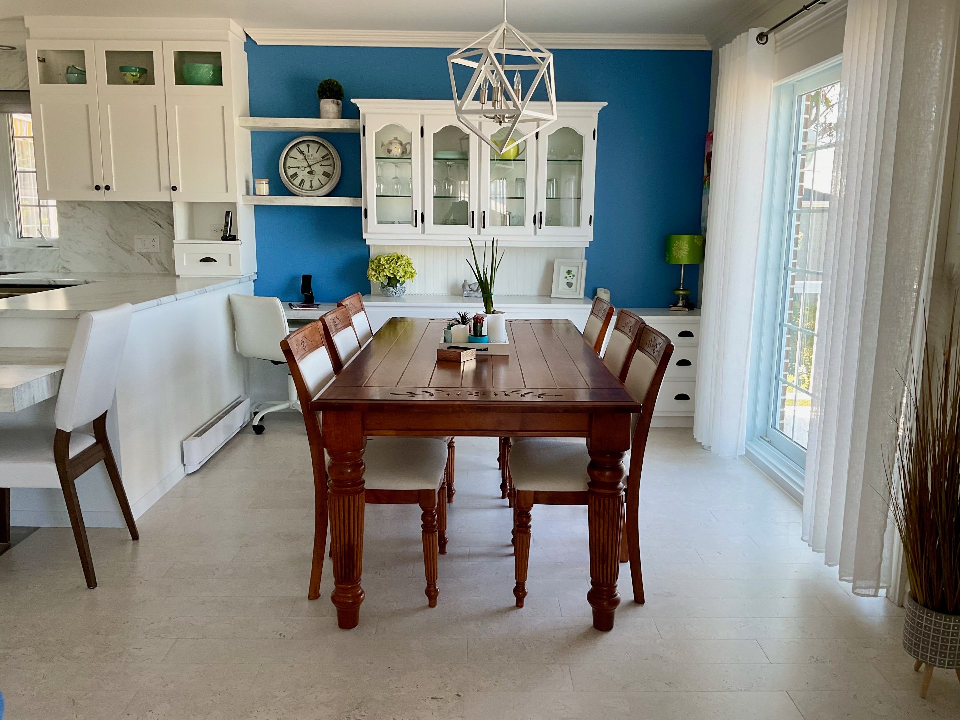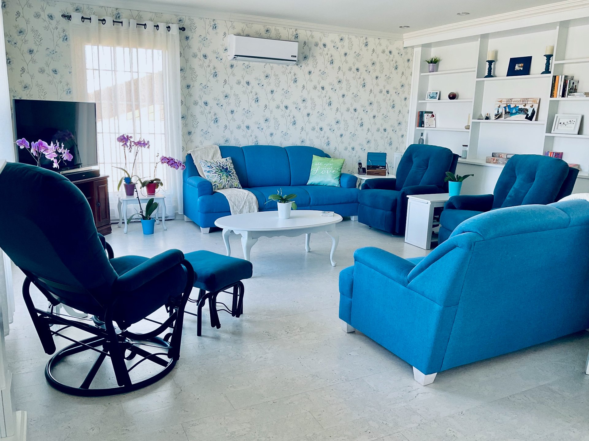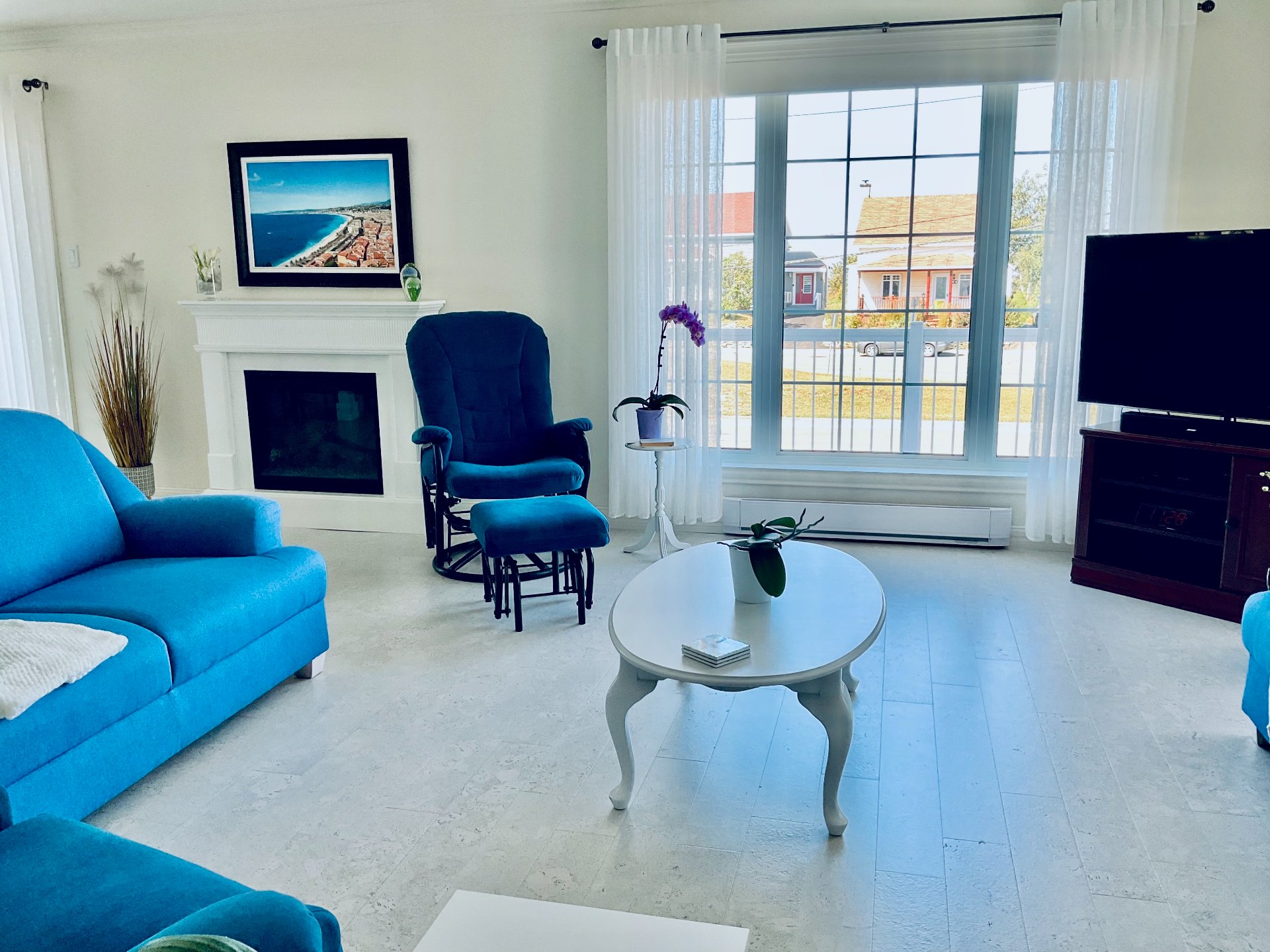 Chambre au sous-sol: stores, tringle à rideaux seulement, télévision.// Solarium: stores et rideaux.// Boudoir ou 3ème chambre: store en bois, étagère, rideaux. // Salle à manger et salon: stores, tringles pour rideaux, foyer électrique.// Chambre principale: store, tringle, télévision 32 pouces fixé au mur.// Cuisine: toile solaire.// Aspirateur central et accessoires.// 2 thermopompes.