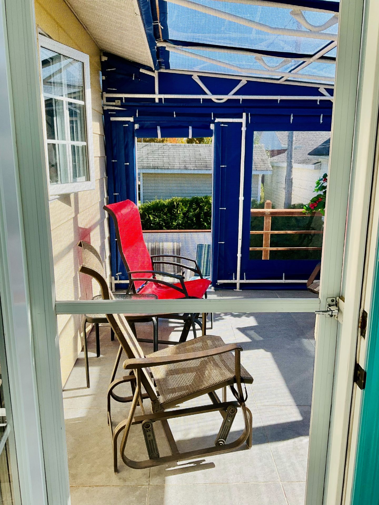 Chambre au sous-sol: stores, tringle à rideaux seulement, télévision.// Solarium: stores et rideaux.// Boudoir ou 3ème chambre: store en bois, étagère, rideaux. // Salle à manger et salon: stores, tringles pour rideaux, foyer électrique.// Chambre principale: store, tringle, meuble coiffeuse et miroir. télévision 32 pouces fixé au mur.// Cuisine: toile solaire.// Aspirateur central et accessoires.// 2 thermopompes.
